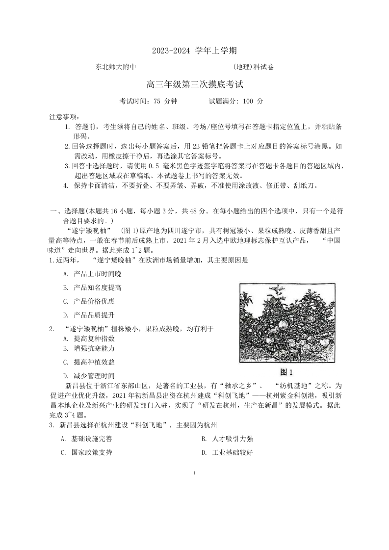 吉林省东北师范大学附属中学2024届高三上学期第三次摸底地理