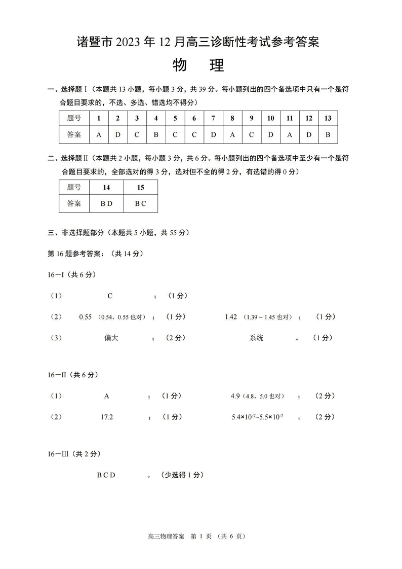 浙江省诸暨市2024届高三上学期12月诊断性考试物理答案