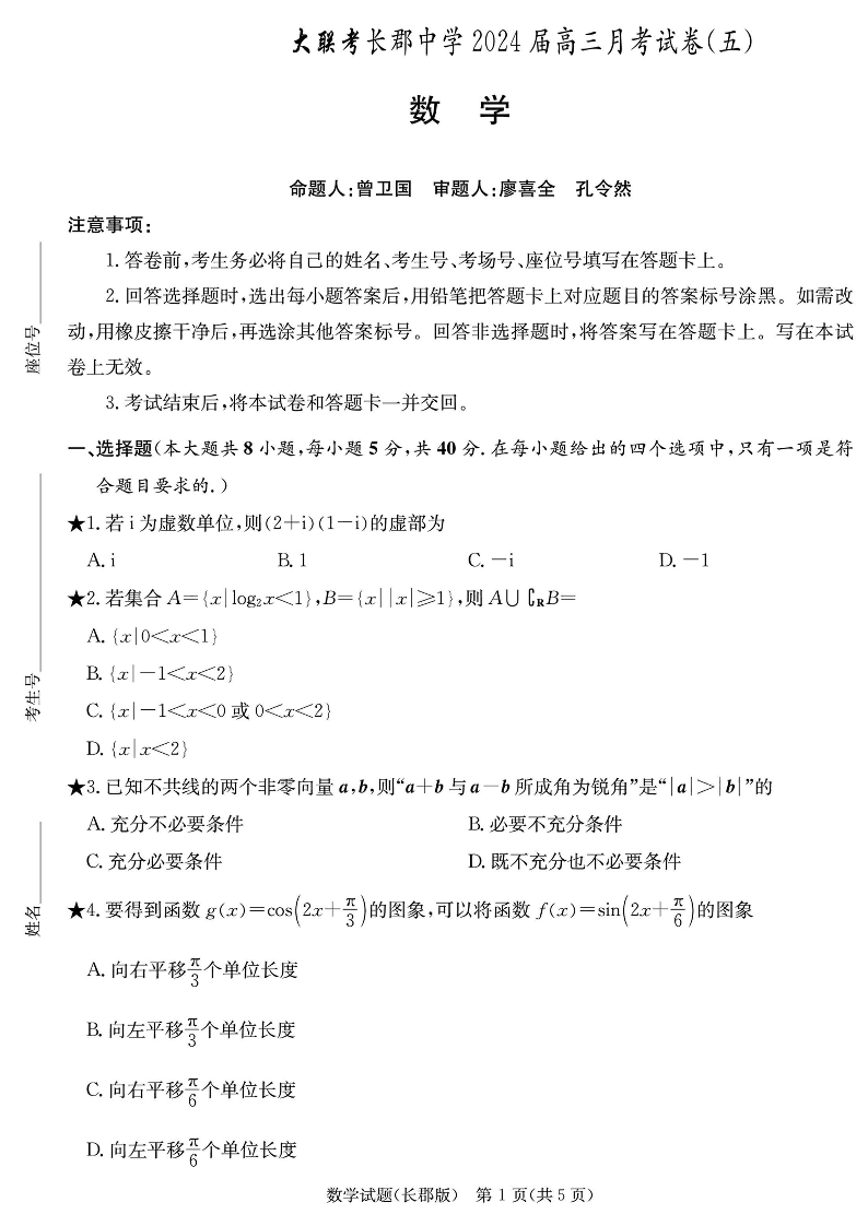 湖南省长沙市长郡中学2024届高三上学期月考(五)数学