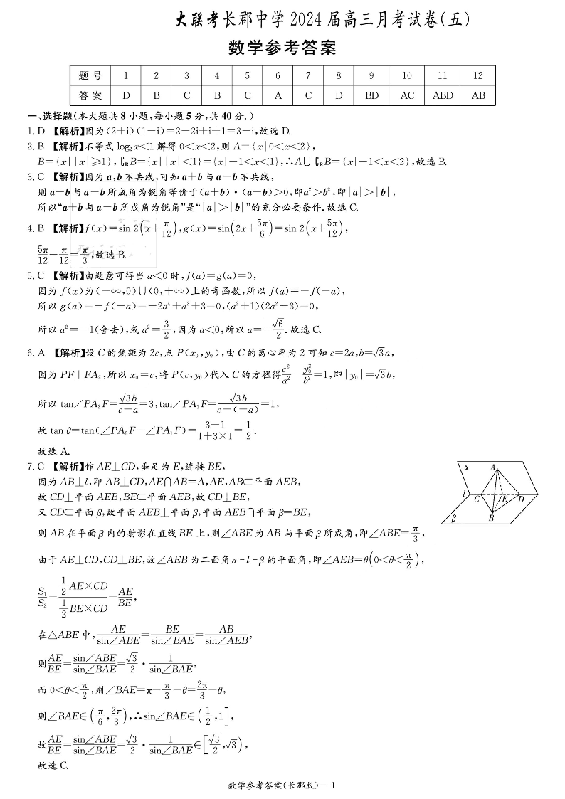 湖南省长沙市长郡中学2024届高三上学期月考(五)数学答案