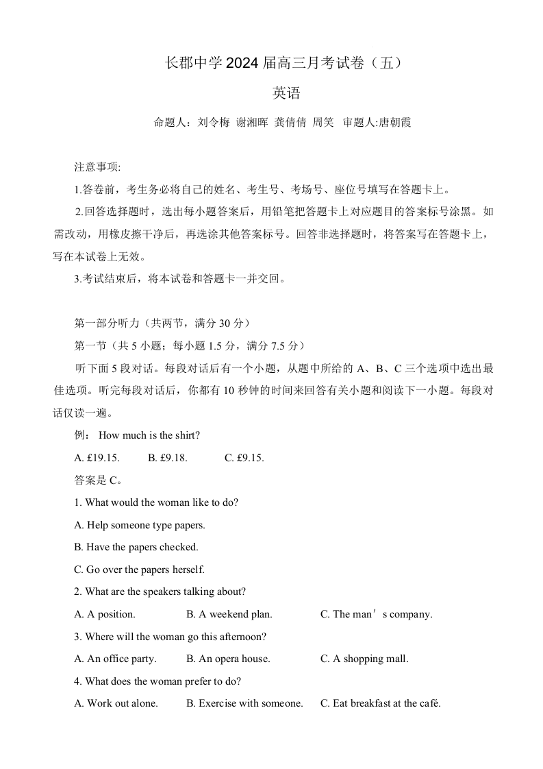 湖南省长沙市长郡中学2024届高三上学期月考(五)英语