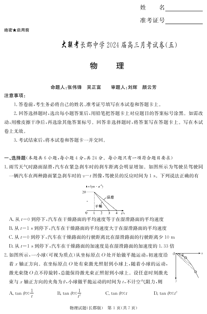 湖南省长沙市长郡中学2024届高三上学期月考(五)物理