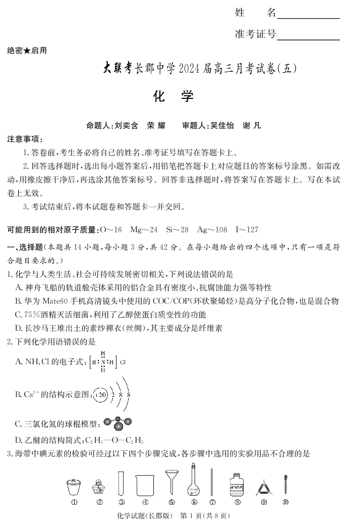 湖南省长沙市长郡中学2024届高三上学期月考(五)化学