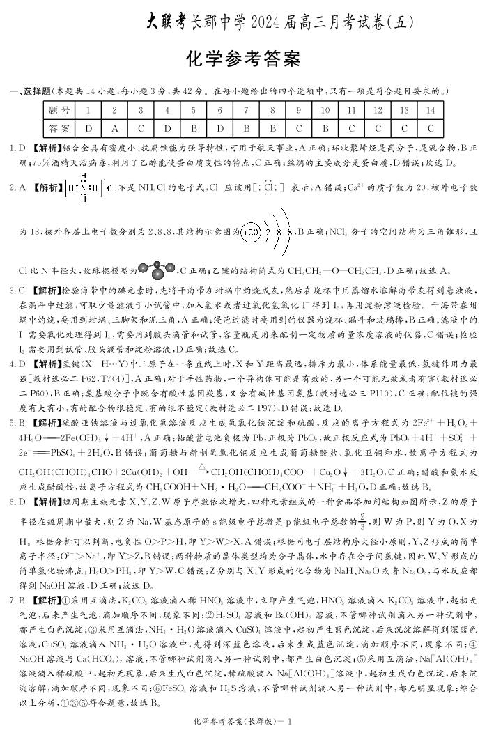 湖南省长沙市长郡中学2024届高三上学期月考(五)化学答案