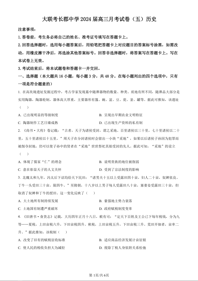 湖南省长沙市长郡中学2024届高三上学期月考(五)历史(原卷版)