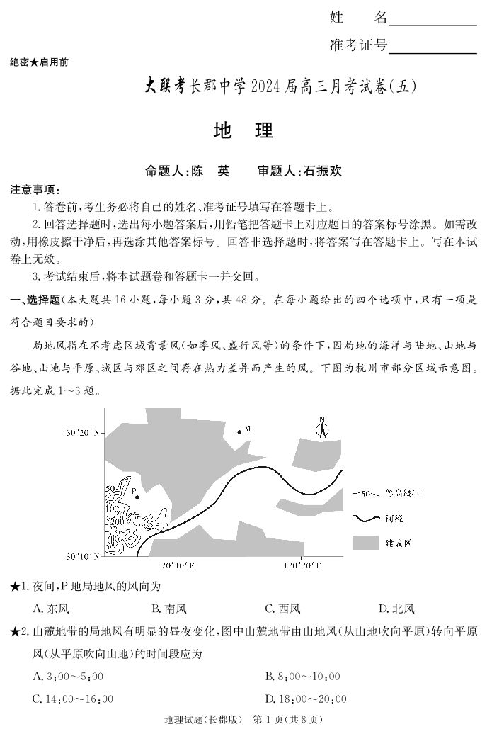 湖南省长沙市长郡中学2024届高三上学期月考(五)地理