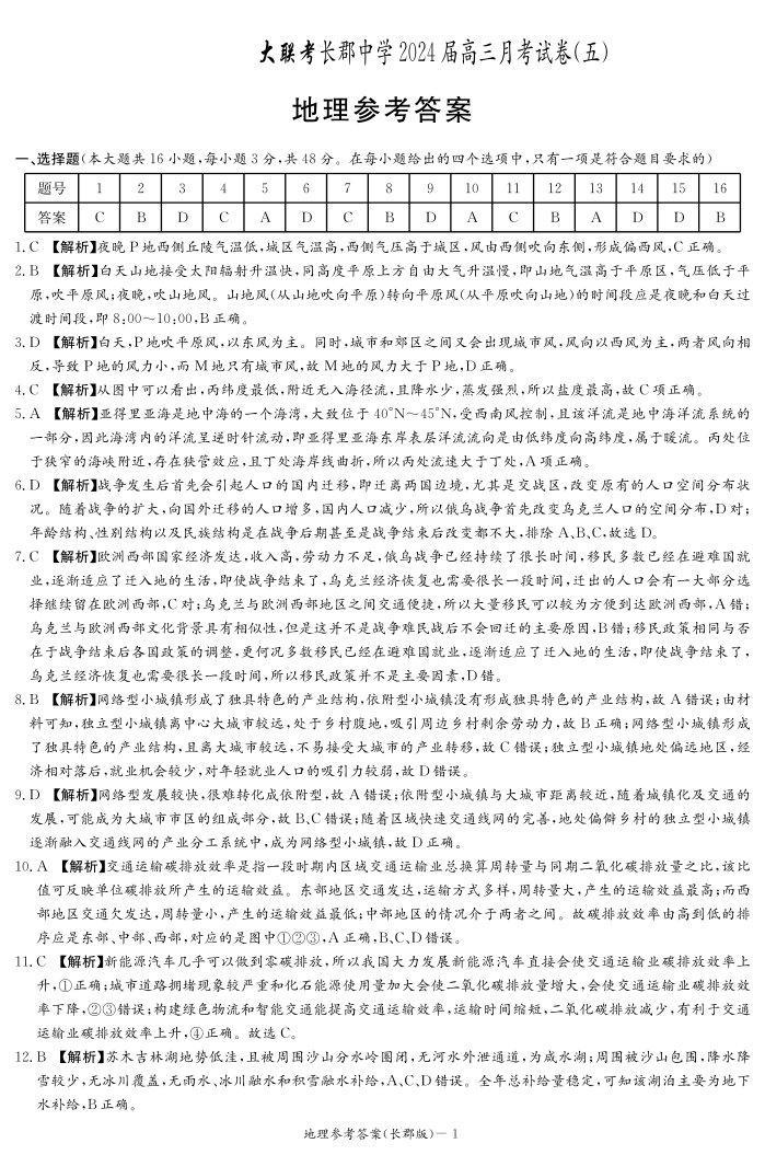 湖南省长沙市长郡中学2024届高三上学期月考(五)地理答案