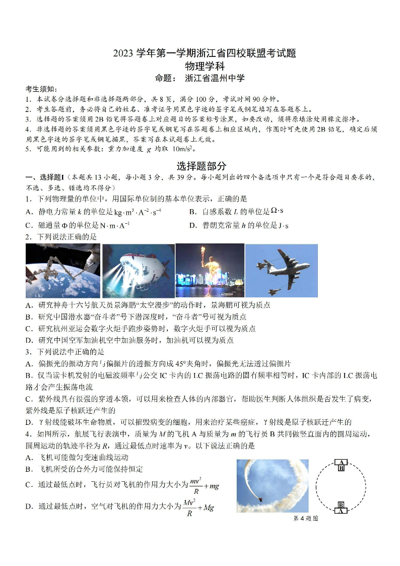 浙江四校联盟2024届高三上学期12月联考物理