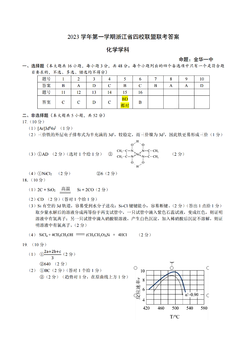 浙江四校联盟2024届高三上学期12月联考化学答案