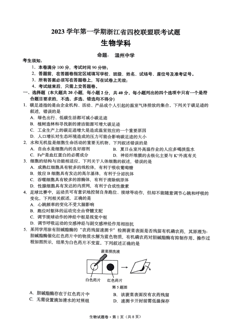 浙江四校联盟2024届高三上学期12月联考生物