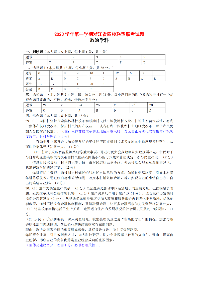 浙江四校联盟2024届高三上学期12月联考政治答案