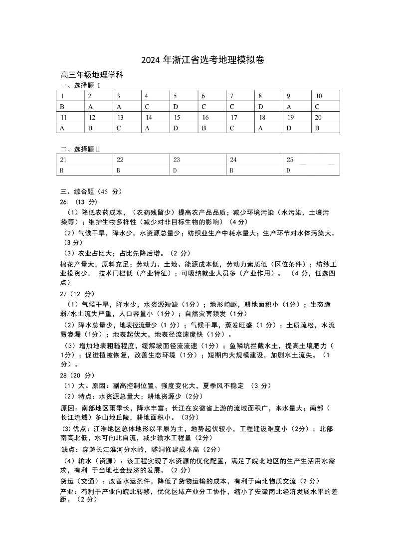浙江四校联盟2024届高三上学期12月联考地理答案