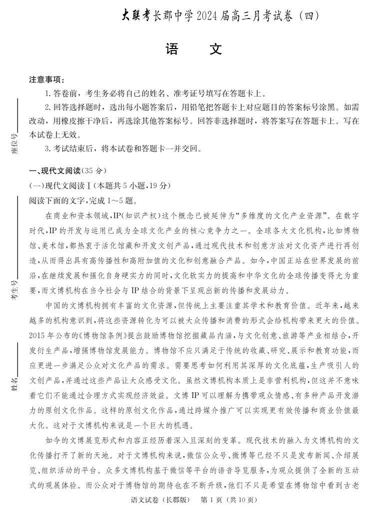 湖南省长郡中学2024届高三上学期月考(四)语文