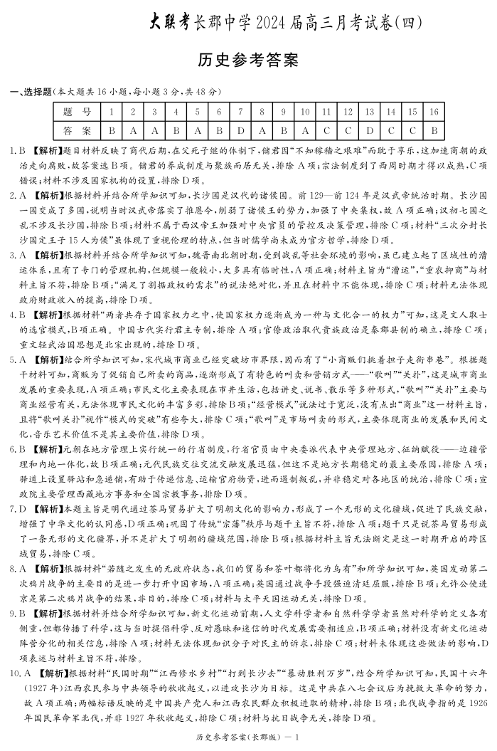 湖南省长郡中学2024届高三上学期月考(四)历史答案