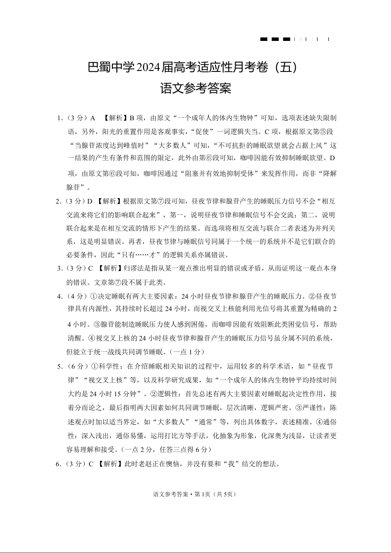 重庆市巴蜀中学2024 届高考适应性月考卷 (五)语文答案