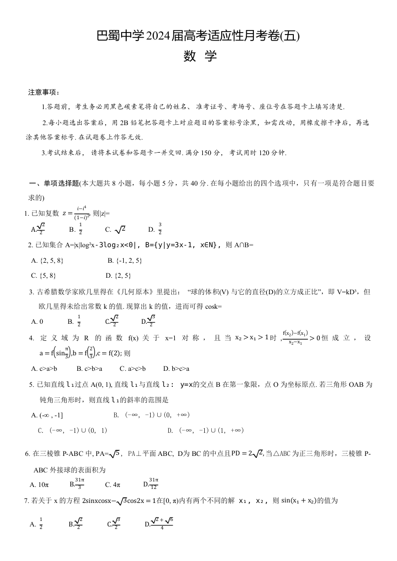 重庆市巴蜀中学2024 届高考适应性月考卷 (五)数学