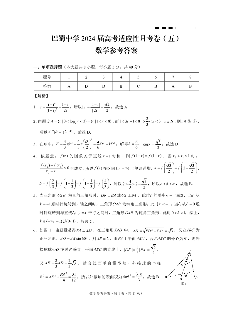 重庆市巴蜀中学2024 届高考适应性月考卷 (五)数学答案