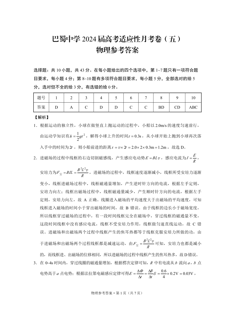 重庆市巴蜀中学2024 届高考适应性月考卷 (五)物理答案