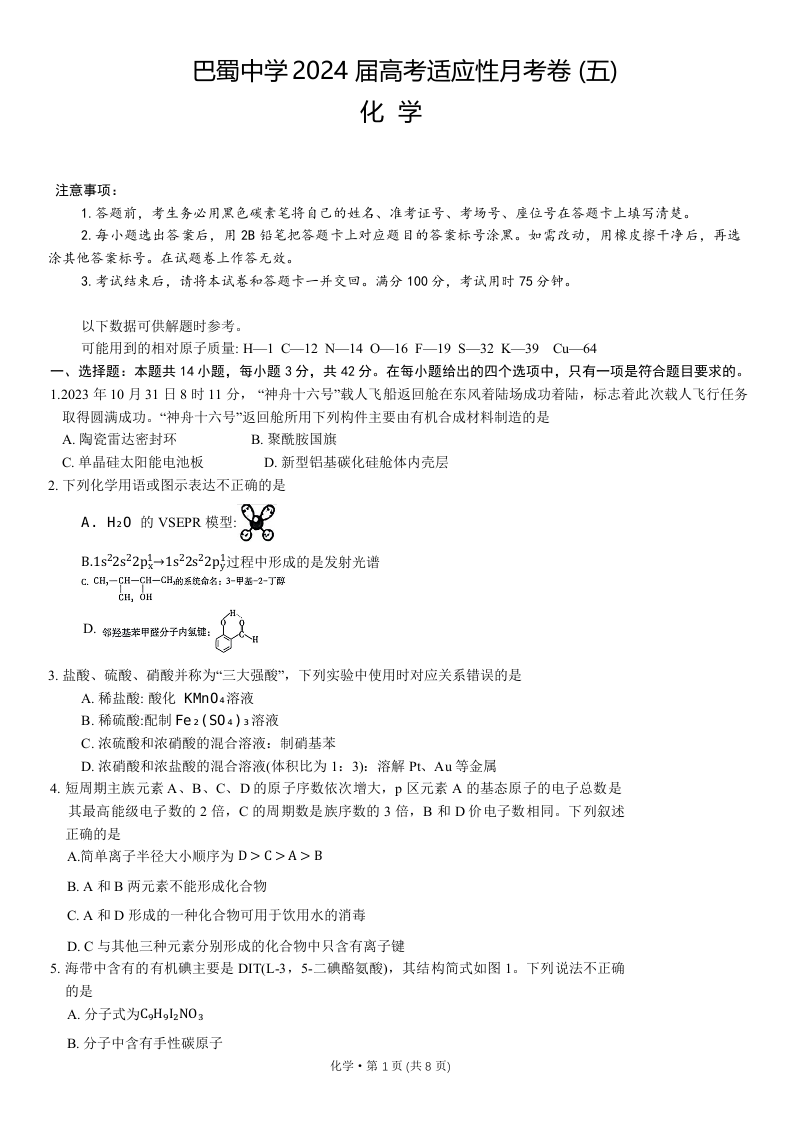重庆市巴蜀中学2024 届高考适应性月考卷 (五)化学