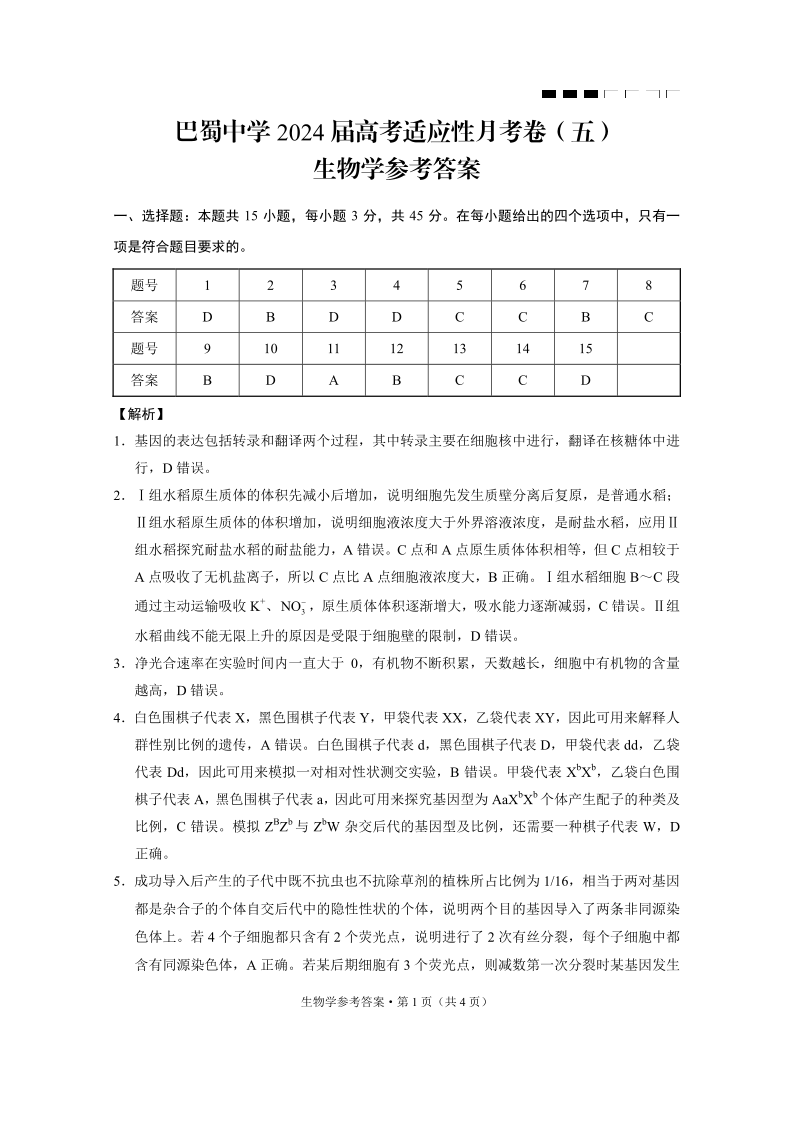 重庆市巴蜀中学2024 届高考适应性月考卷 (五)生物答案