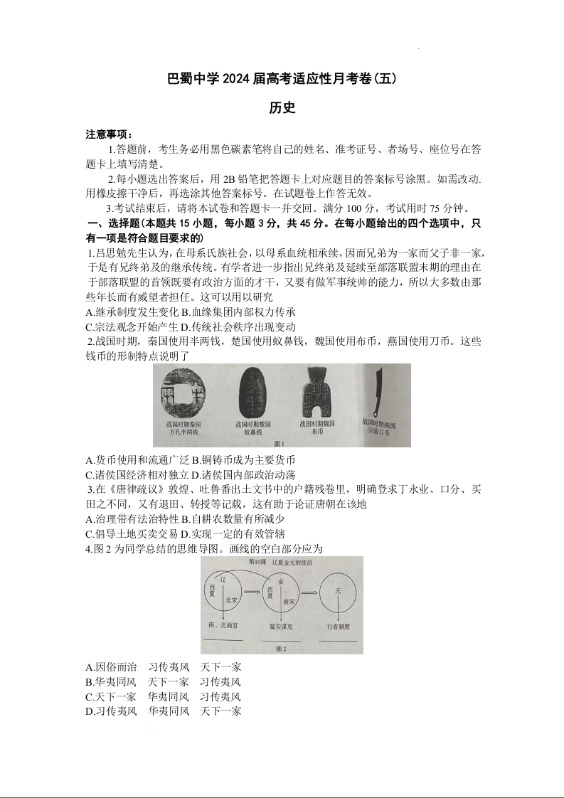 重庆市巴蜀中学2024 届高考适应性月考卷 (五)历史+答案