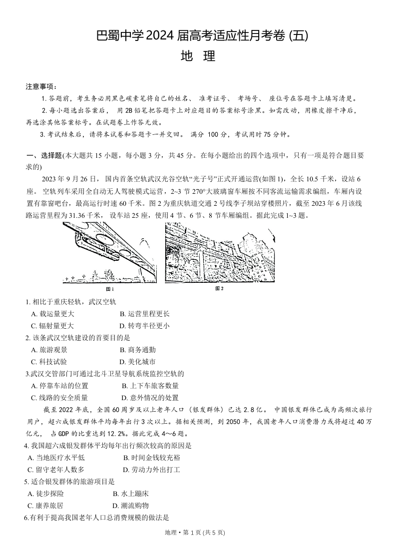 重庆市巴蜀中学2024 届高考适应性月考卷 (五)地理