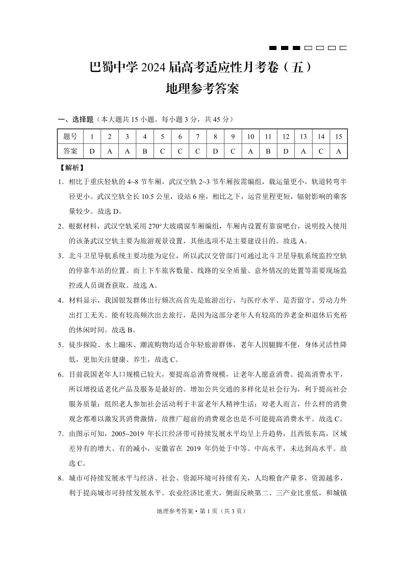 重庆市巴蜀中学2024 届高考适应性月考卷 (五)地理答案
