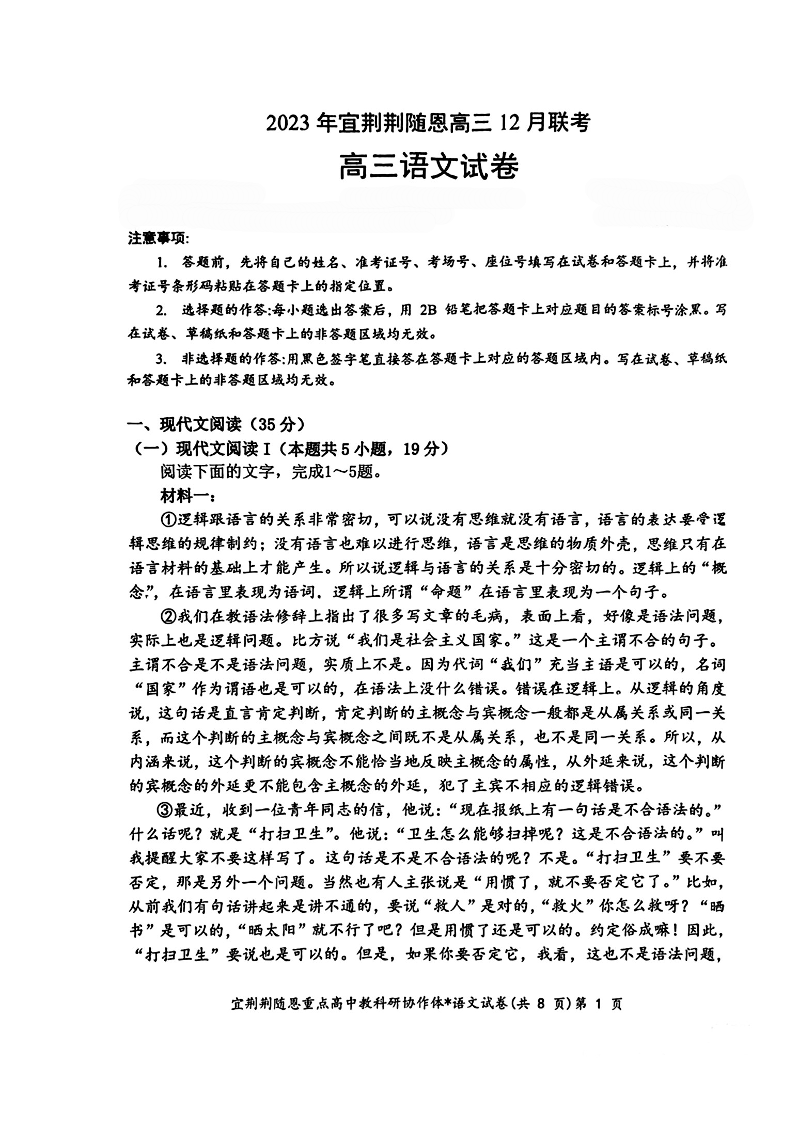 湖北省宜荆荆恩2024届高三上学期12月联考语文+答案