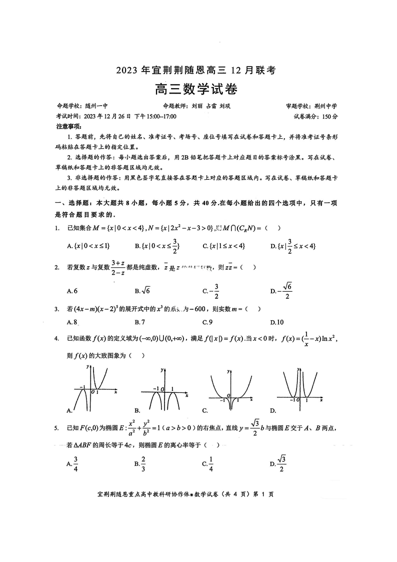 湖北省宜荆荆恩2024届高三上学期12月联考数学+答案