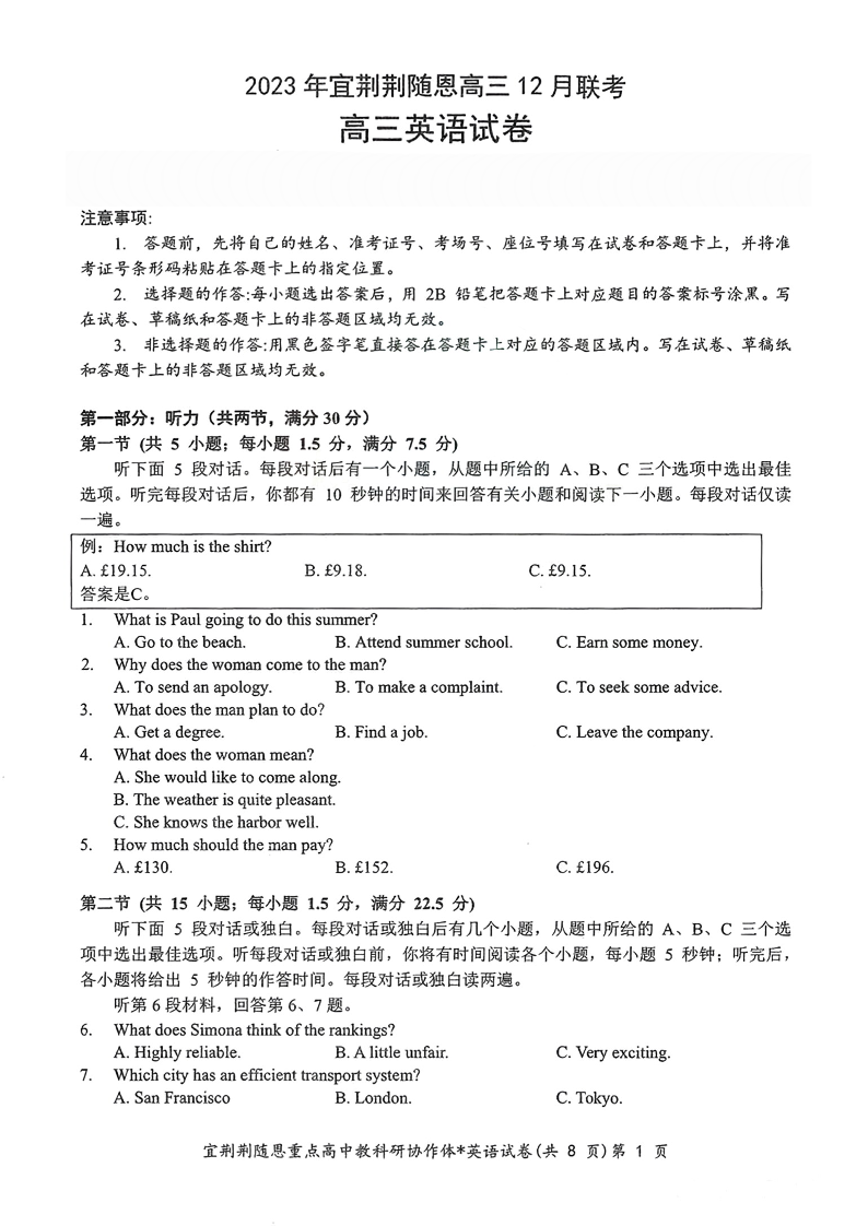 湖北省宜荆荆恩2024届高三上学期12月联考英语+答案