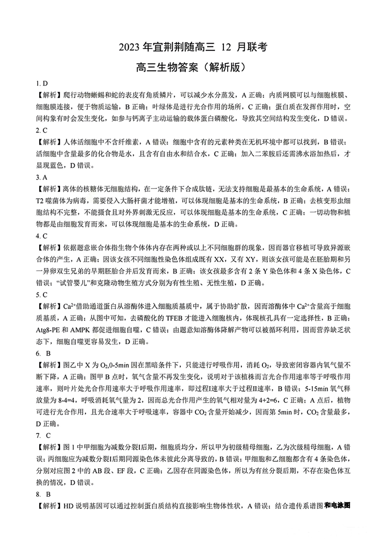 湖北省宜荆荆恩2024届高三上学期12月联考生物答案