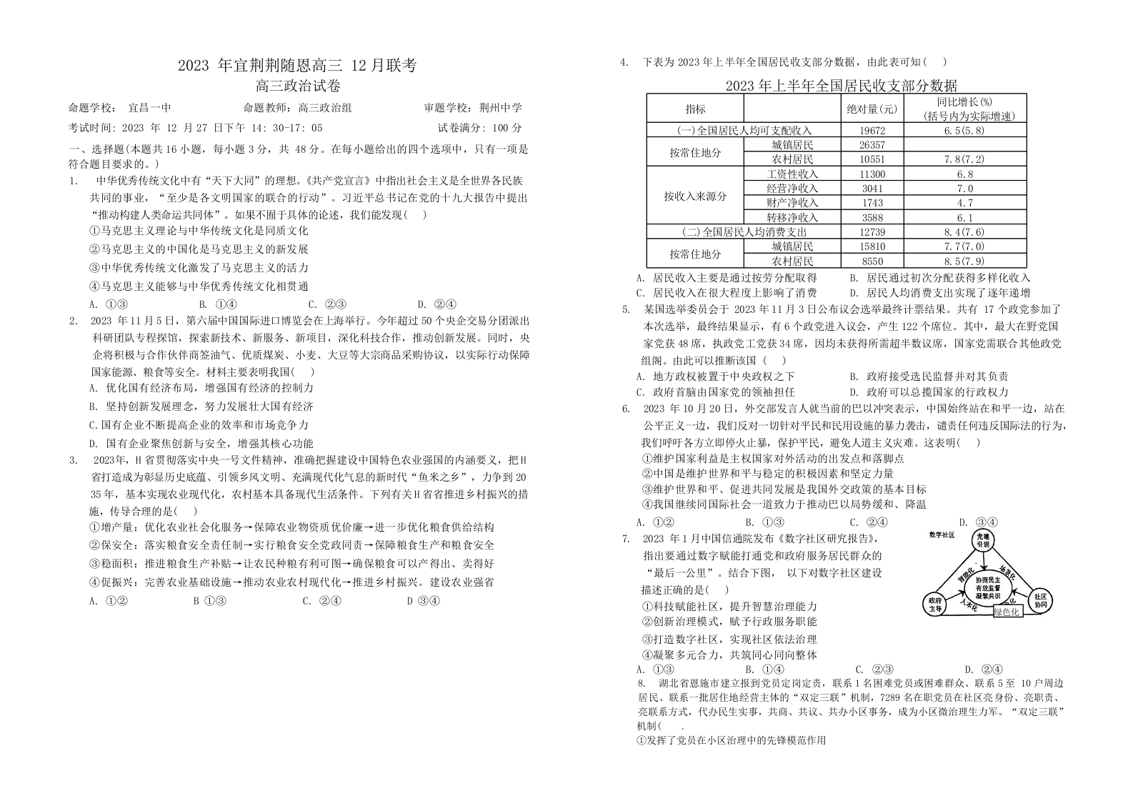 湖北省宜荆荆恩2024届高三上学期12月联考政治