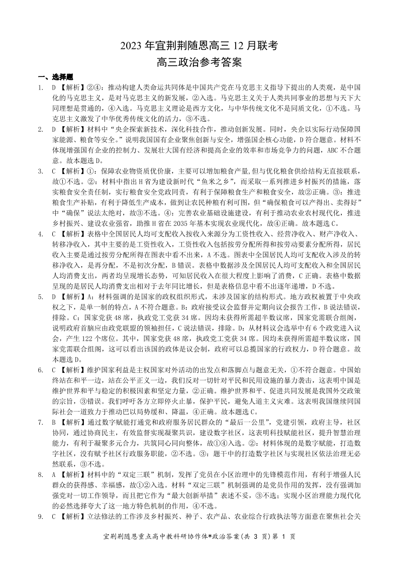 湖北省宜荆荆恩2024届高三上学期12月联考政治答案