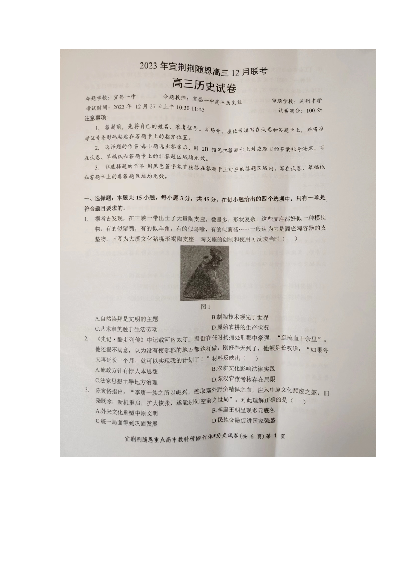 湖北省宜荆荆恩2024届高三上学期12月联考历史+答案