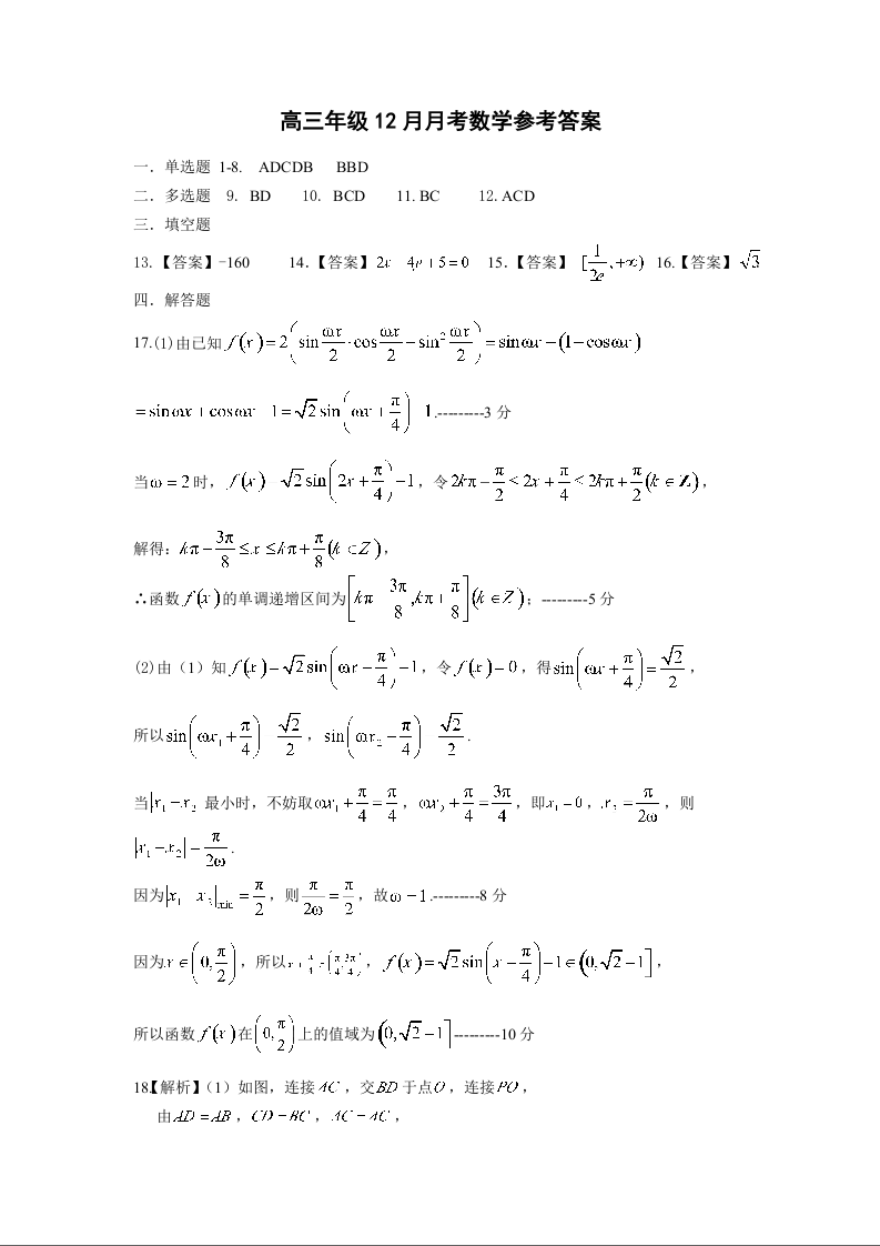 湖北省武昌实验中学2024届高三上学期12月月考数学答案