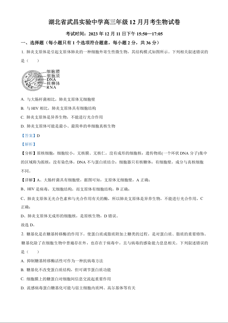 湖北省武昌实验中学2024届高三上学期12月月考生物(精品解析版)