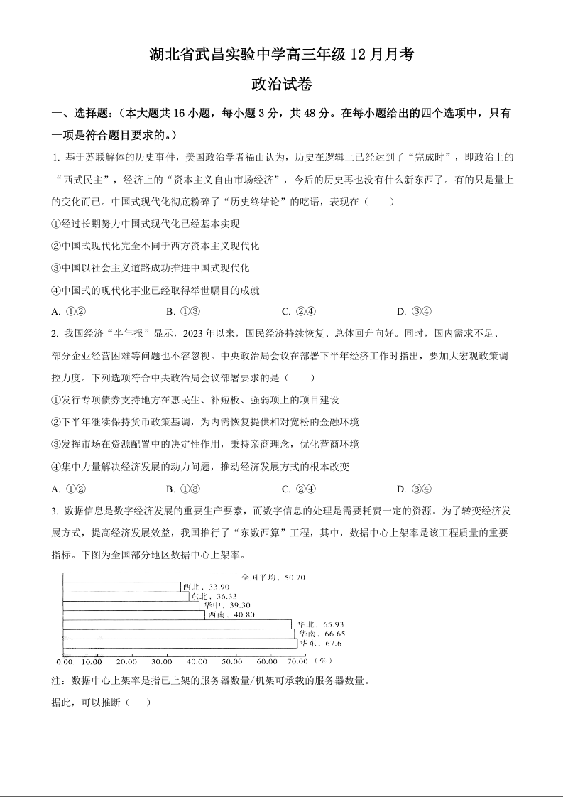 湖北省武昌实验中学2024届高三上学期12月月考政治(原卷版)