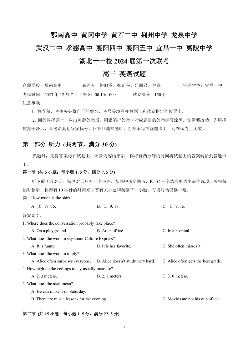 湖北省十一校2024届高三上学期第一次联考英语+答案