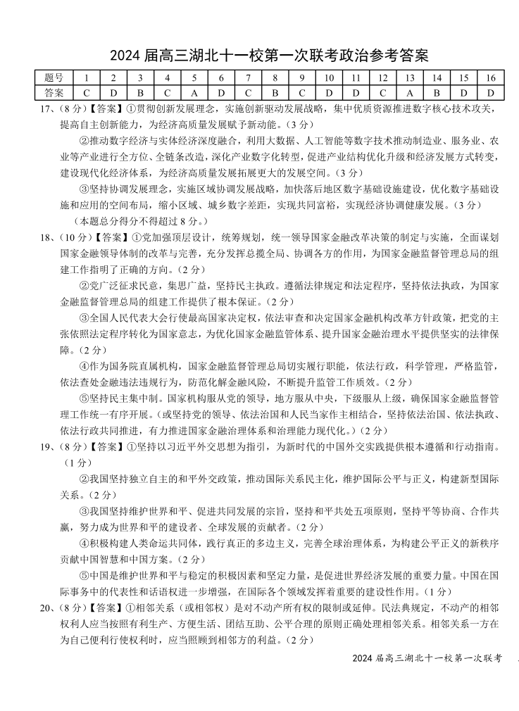 湖北省十一校2024届高三上学期第一次联考政治答案