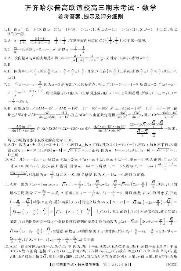 黑龙江省齐齐哈尔市普高联谊校2024届高三上学期12月期末数学答案