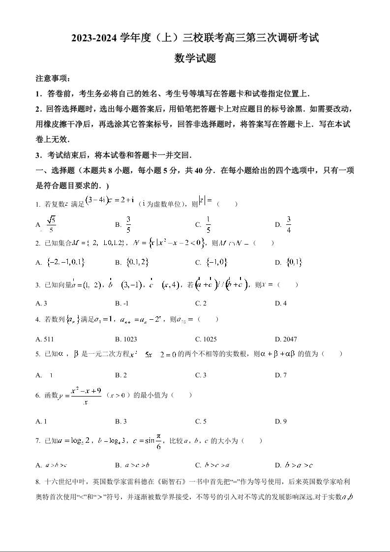 黑龙江省佳木斯市三校联考2024届高三上学期第三次调研考试数学+答案