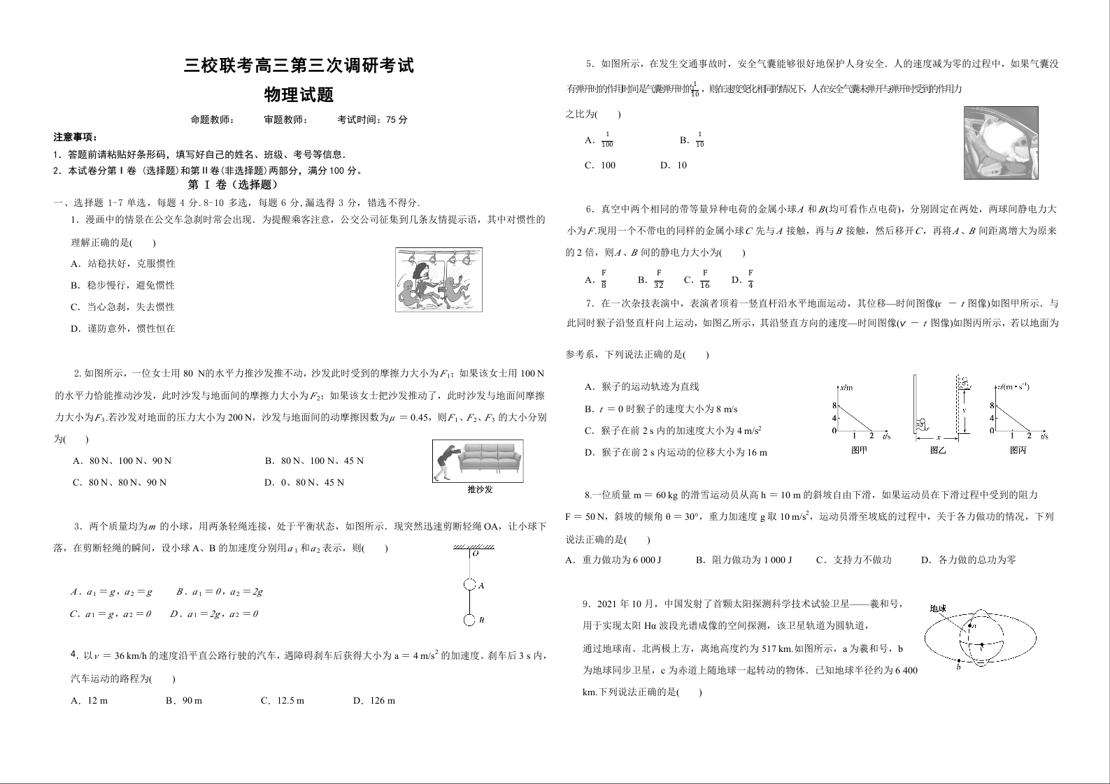 黑龙江省佳木斯市三校联考2024届高三上学期第三次调研考试物理+答案