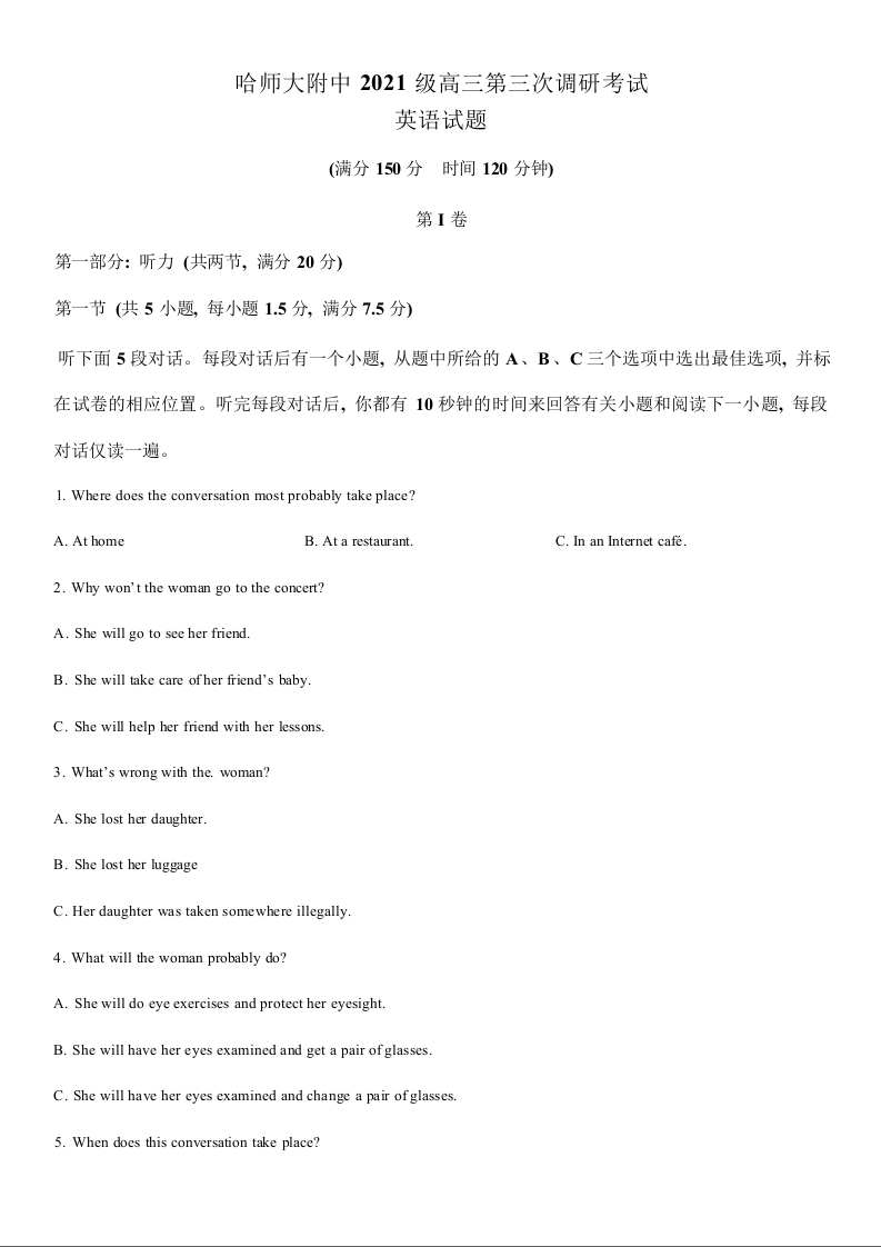 黑龙江省哈尔滨师范大学附属中学2024届高三上学期第三次调研考试(11月期中)英语