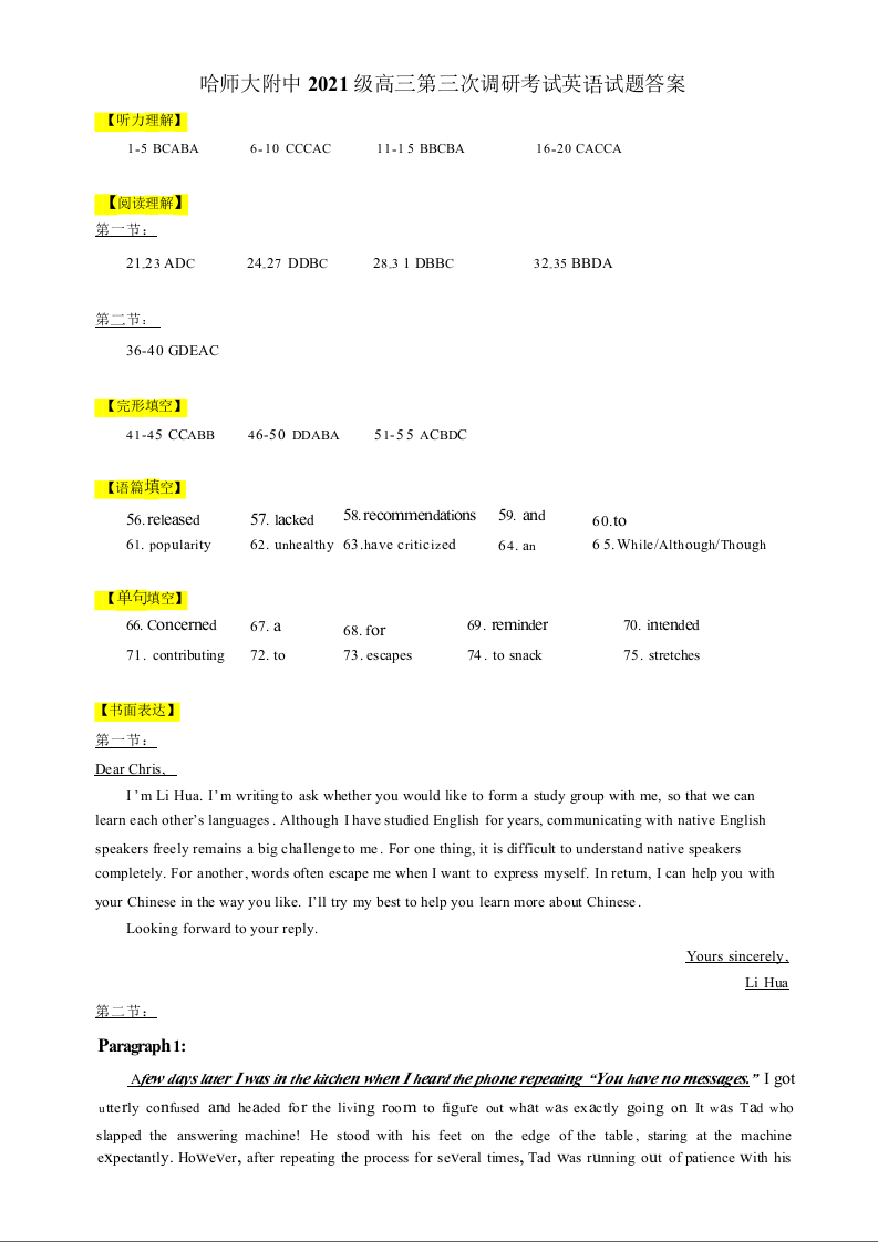黑龙江省哈尔滨师范大学附属中学2024届高三上学期第三次调研考试(11月期中)英语答案