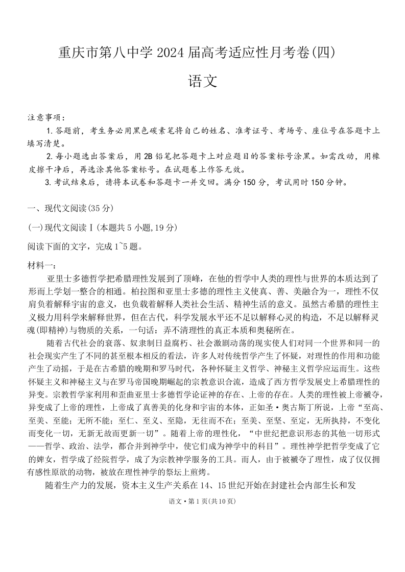 重庆市第八中学2024届高考适应性月考卷(四)语文