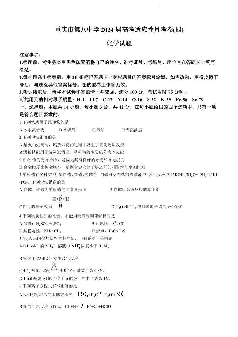 重庆市第八中学2024届高考适应性月考卷(四)化学