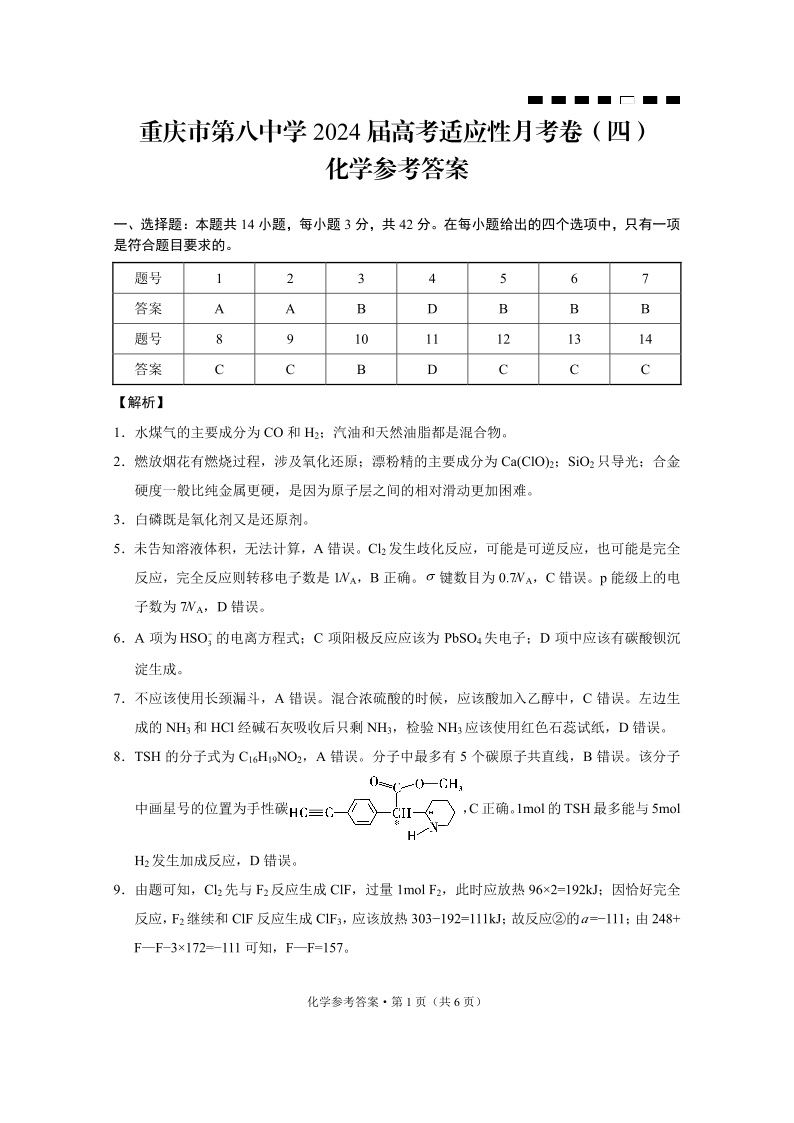 重庆市第八中学2024届高考适应性月考卷(四)化学答案