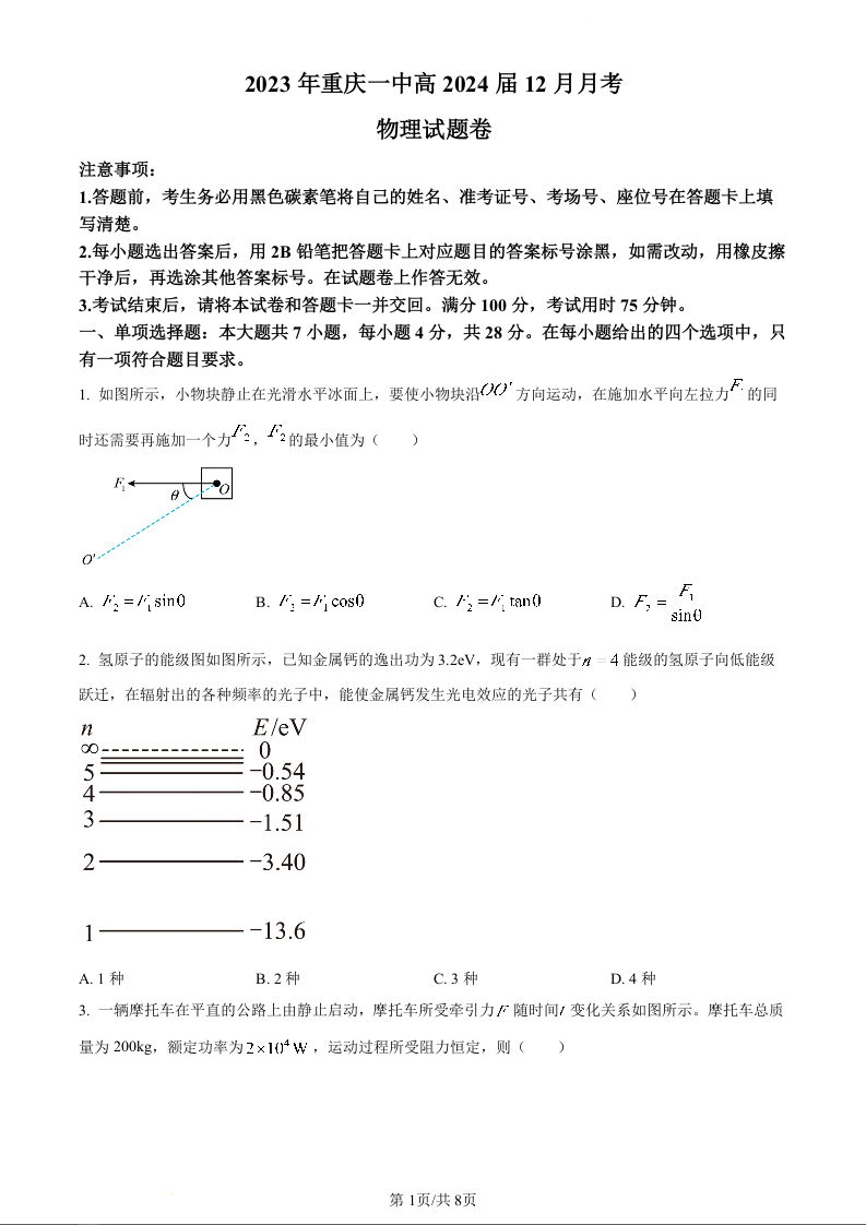重庆市第一中学校2024届高三上学期12月月考物理(原卷版)