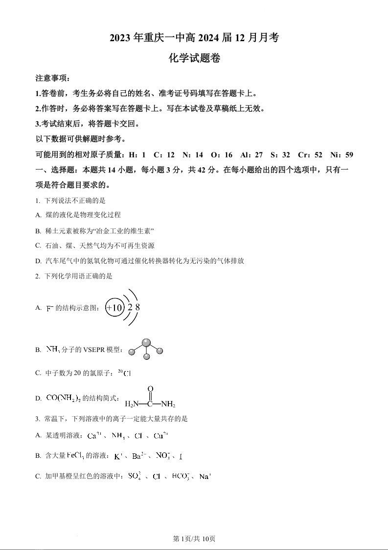 重庆市第一中学校2024届高三上学期12月月考化学(原卷版)
