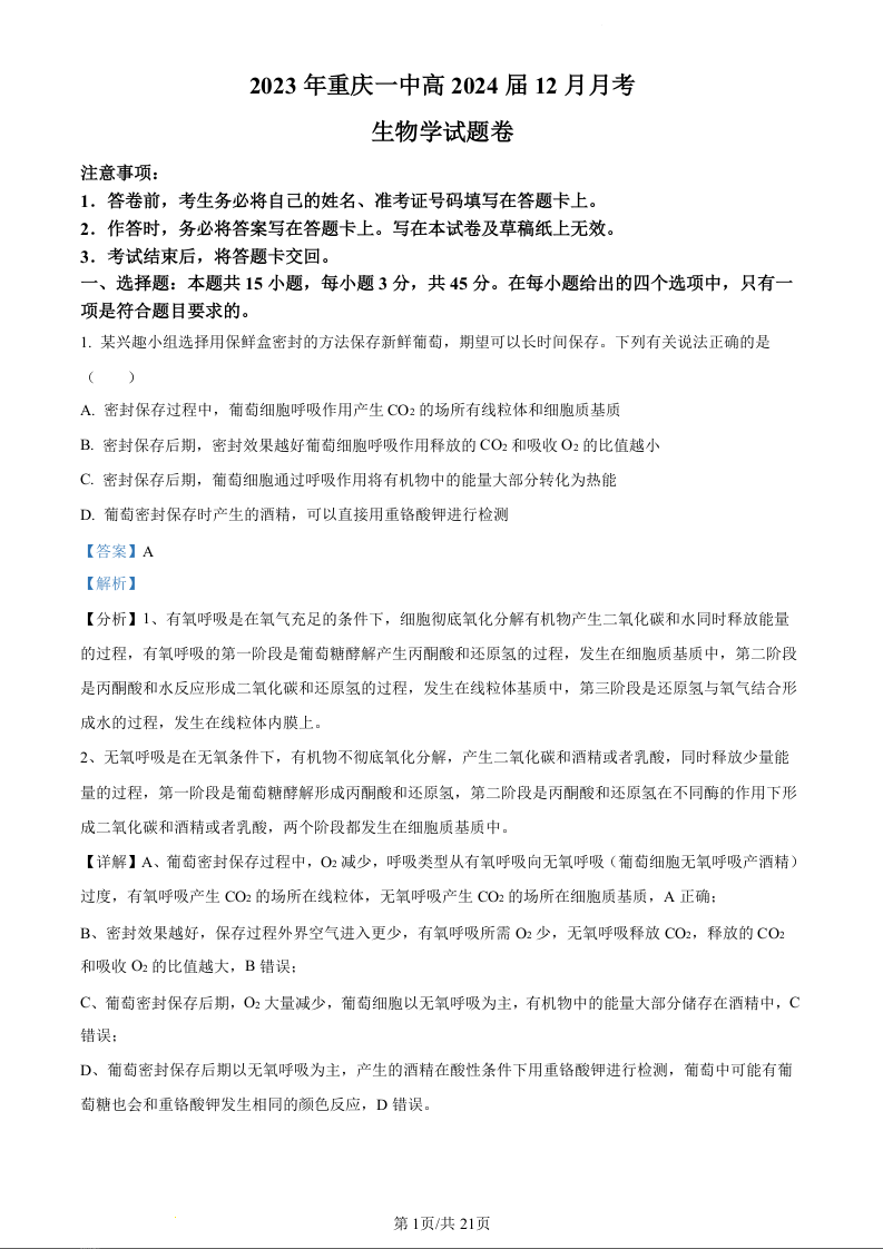 重庆市第一中学校2024届高三上学期12月月考生物(精品解析版)